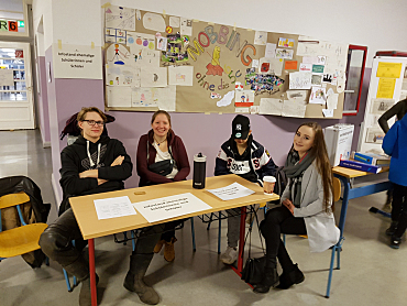 Ehemalige Schüler und Schülerinnen mit ihrem Infostand