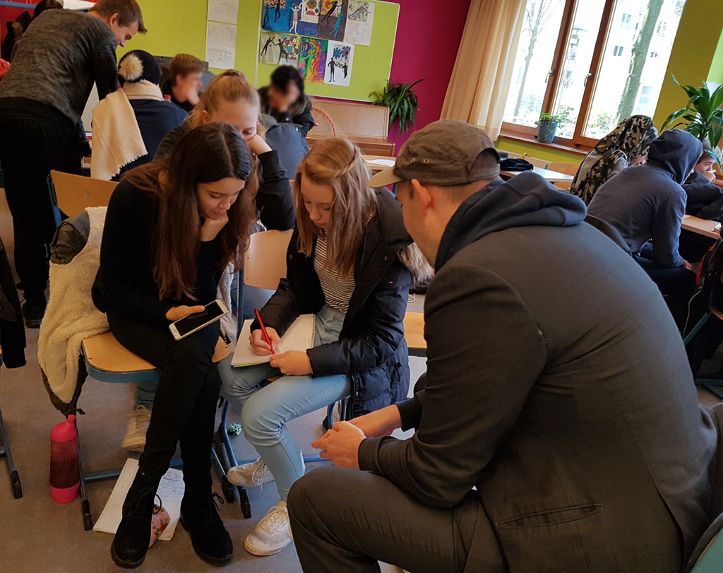 Bas Böttcher hilft Merle, Nora und Michelle bei der Umsetzung ihrer Gedanken.