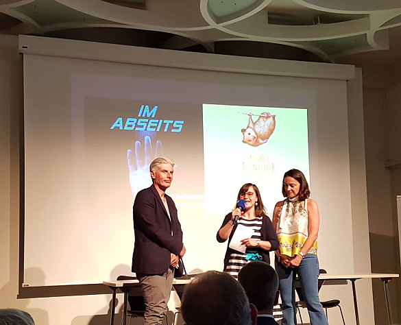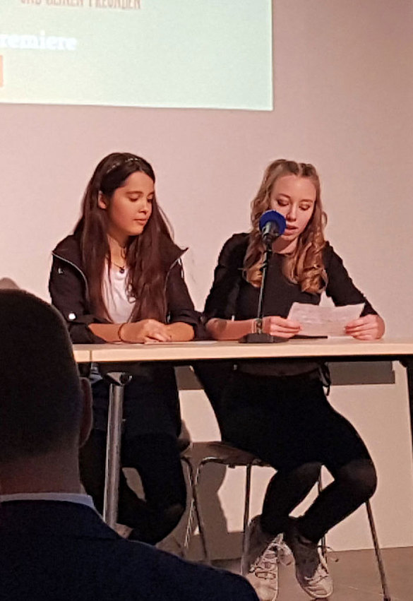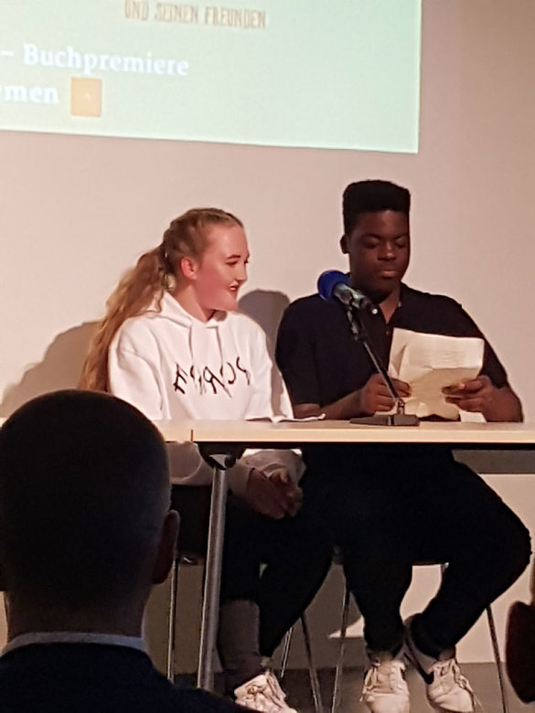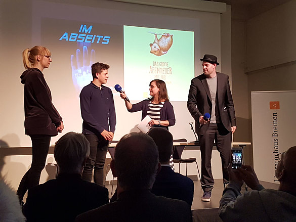 Das Interview mit Bas Böttcher und Luise Brunßen und Fabio Leschinsky-Rosales, stellvertretend für die Klasse 9c, durfte natürlich auch nicht fehlen. Luise und Fabio beantworteten mit Bravur die Fragen der Moderatorin zur Entstehung des Schulhausromanes "Im Abseits".