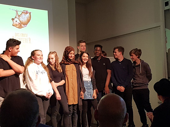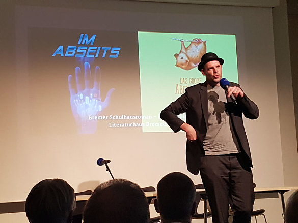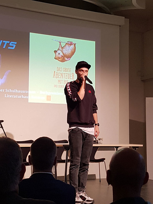 Als dann Bas Böttcher auf die Bühne kam, um sein Gedicht "die Stadtmusikanten" vorzutragen und den Schulhausroman "Im Abseits" anzukündigen, wurde es für die Schülerinnen und Schüler der 9c, die vorlesen sollten, ernst.