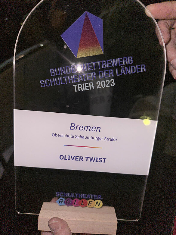 Die bilinguale Klasse 9a vertrat vom 16.-21.09.2023 das Bundesland Bremen beim Wettbewerb, der dieses Jahr von Rheinland-Pfalz in Trier ausgerichtet wurde. Mit dem Stück „Oliver Twist - I want more“ begeisterten die Schülerinnen und Schüler der Schwerpunktklasse Theater das Publikum. Außerdem konnten sie in Workshops und im Austausch mit theaterbegeisterten Schülerinnen und Schülern aus ganz Deutschland ihr Repertoire erweitern. Nach einer ereignisreichen Woche hieß es dann Abschied nehmen und nach Bremen zurückzukehren, um dort an neuen Produktionen zu arbeiten.