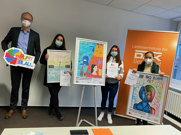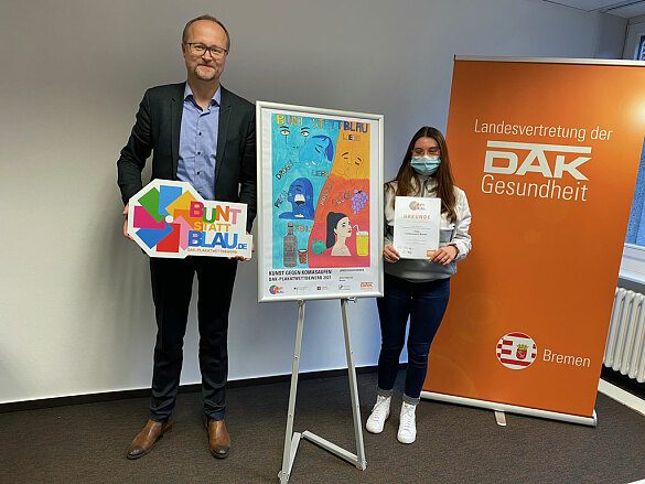 „bunt statt blau“: Unter diesem Motto beteiligten sich im Frühjahr bundesweit rund 4.000 Schülerinnen und Schüler am Plakatwettbewerb der DAK-Gesundheit gegen das sogenannte Komasaufen bei Jugendlichen. In Bremen kommt das beste Plakat für die Präventionskampagne der Krankenkasse von Ahtila Puskoriute aus der ehemaligen 10b. Neben dem Landessieg ging auch der 3. Platz an Agnesa Fazliu aus der ehemaligen 10d und der Sonderpreis Junge Künstler an Aliya Raho aus der 7d an unsere Schule.