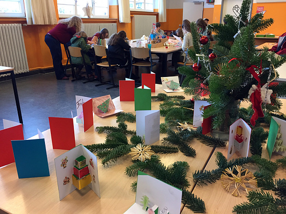 Am Tag der Offenen Tür wurde das Gesamtwerk der Klasse im Kunstraum ausgestellt und die Besucher angeleitet, selbst Weihnachtsklappkarten herzustellen.