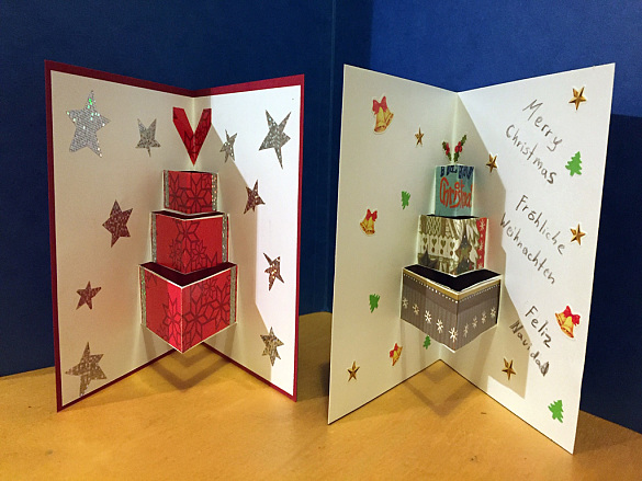 Im Kunstunterricht entstanden tolle Karten, die beim Aufklappen mit einem Pop-Up-Effekt dreidimensionale Gebilde hervortreten lassen. Kreativ und künstlerisch zeigten sich die Schüler und so manches Werk wird sicherlich zur Weihnachtszeit als Gruß genutzt und die Augen des Beschenkten zum Leuchten bringen.