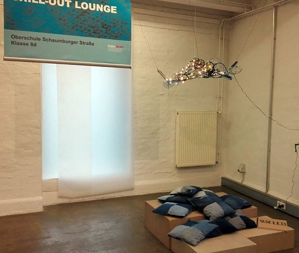 Die 8d nähte Kissen aus alten Jeans und fertigte einen „Himmel“ aus Lichtern und Traumfängern an. Gemütlich auf den Kissen liegen und in den „Himmel“ schauen, das sollte der Besucher bei der so entstandenen CHILL-OUT-LOUNGE.