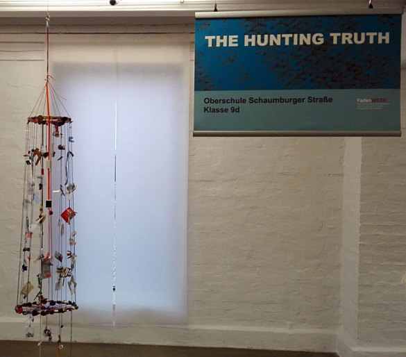 Auf Ungerechtigkeiten bei der Produktion von Kleidungsstücken, die vielen Missstände in diesem Bereich und die eigenen oft zu vollen Kleidungsschränke wollte die 9d mit ihrem Mobile „THE HUNTING TRUTH“ hinweisen.