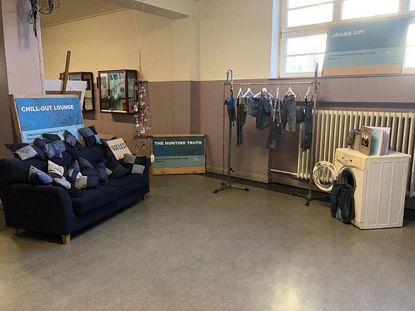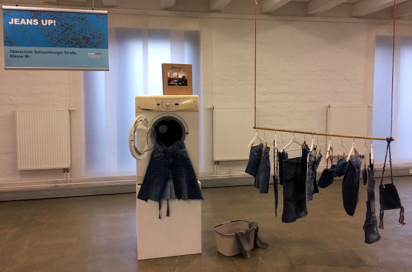 Mit „JEANS UP!“ bewies die Klasse 9b ihre Kreativität, indem sie aus alten Jeans neue Designerstücke nähte und neben einer echten Waschmaschine in Szene setzte.