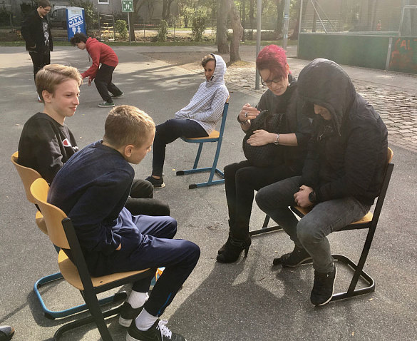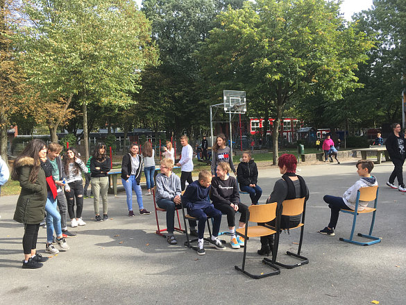 Das Stück wurde mit einem Signal beendet und die SchülerInnen der 8b riefen laut den Slogan “Stoppt den Rassismus, werdet eine Schule gegen Rassismus!“ Danach packten sie ihre Stühle und gingen zurück ins Gebäude. Dieser Flashmob forderte von den beteiligten SchülerInnen großen Mut und veranlasste auch eine Menge Schüler, dem dargebotenen Stück zu folgen.