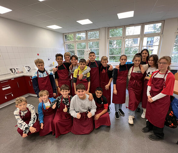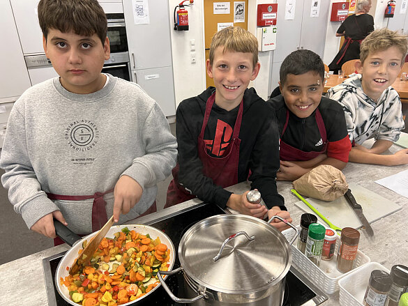 Am Donnerstag war es dann soweit. Statt den Ball zu kicken, wurde der Kochlöffel geschwungen. Nach zwei Stunden hieß es dann „Guten Appetit“ mit einer Kürbiscremesuppe, einer bunten Nudelpfanne, Rohkostsalat und köstlichen Weintrauben in Mandelsplittersahnesauce. Neben der „Selecao“ kamen auch der Wahlpflichtkurs Haustechnik und Frau Brunke von der Sozialarbeit in den Genuss der leckeren Speisen.
