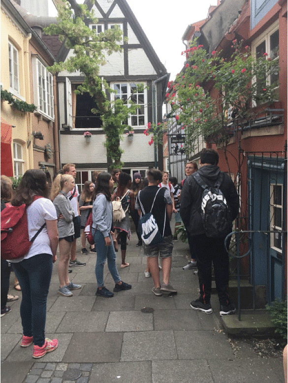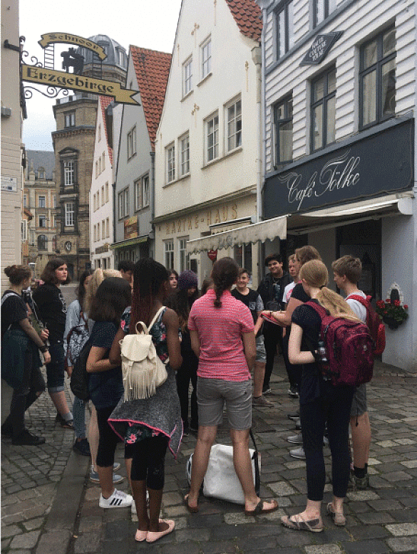 Bremen im Mittelalter: Zu diesem Aspekt haben wir eine besondere Stadtführung gemacht, die uns in die Innenstadt, d.h. zum Dom, zum Katharinenklosterhof, auf den Marktplatz und in den Schnoor geführt hat. Viele mittelalterliche Spuren sind in Bremen aber leider nicht mehr erhalten. Dann haben wir in kleinen Gruppen Themen zur Vertiefung des Themas gewählt und dazu im Computerraum recherchiert und schließlich eigene Texte erarbeitet. Unsere Ausarbeitungen haben wir jeweils in unseren Kleingruppen in der Klasse vorgetragen.