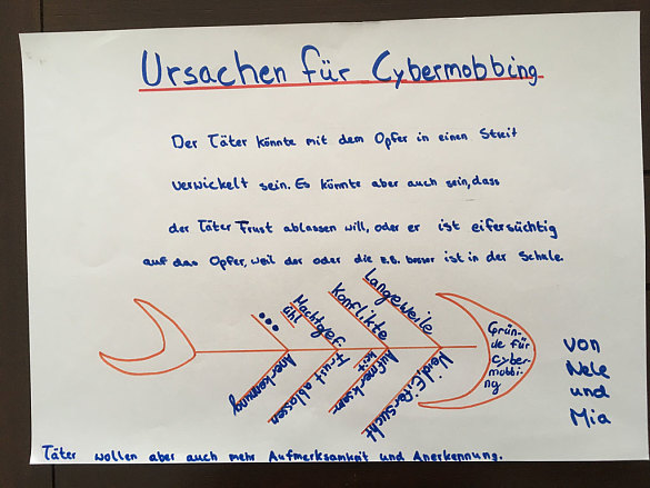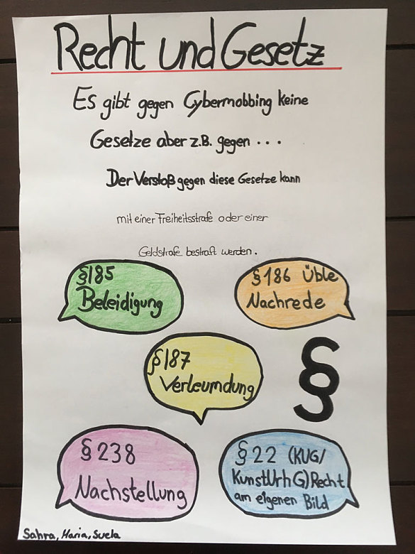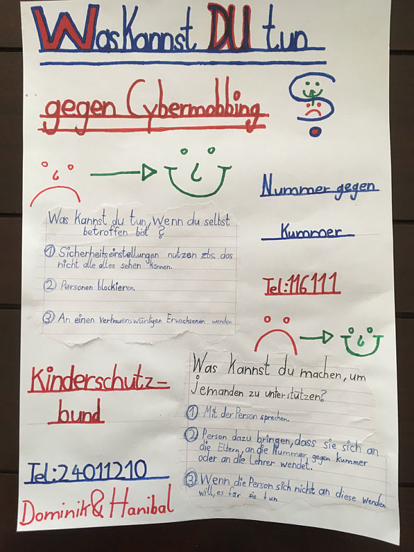 Am 14.2. haben wir im 7. Jahrgang einen Projekttag zum Thema 'Cyber-Mobbing' gemacht. Zuerst haben wir einen kurzen Film zum Thema angeschaut: ‚Let’s fight it together'. Den Film haben wir gemeinsam in den Klassen besprochen und ausgewertet. Wir haben dann eine gemeinsame Definition für Cyber-Mobbing gesucht und gefunden. Wichtig für uns waren auch die Fragen, warum Täter so etwas machen und was die Anlässe oder Auslöser dafür sind? Auch die Frage nach den Folgen von solchen Aktionen haben wir besprochen und ob Cyber-Mobbing eigentlich strafbar ist? Natürlich wollten wir auch wissen, wie man sich schützen kann bzw. was man zur Vorbeugung und Verhinderung tun kann.