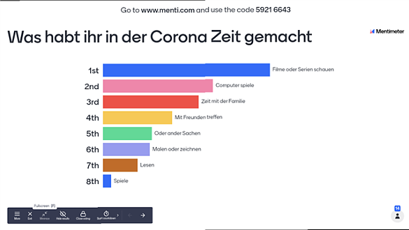 Da ich mich gefragt habe, was meine Mitschüler und Mitschülerinnen so in der Coronazeit machen, dachte ich, ich mache eine Umfrage. Am 25.2 habe ich sie unter der Fragestellung “Was habt ihr in der Corona-Zeit gemacht?” gestartet und am 4.3 ausgewertet. Die Umfrage erreichte die 6d, die 9a und die 9b, davon haben 19 Schüler:innen teilgenommen. Die meisten Befragten haben Filme und Serien angekreuzt, danach kam Zeit mit der Familie. Am dritthäufigsten haben die Teilnehmer:innen für Computerspiele abgestimmt, darauf folgte Mit Freunden treffen, an fünfter Stelle wurde für Andere Sachen abgestimmt, an sechster Stelle Malen oder Zeichnen und Lesen und als letztes Spiele. Sonstige Nennungen waren Schulaufgaben, Musik spielen, kochen, spazieren gehen, essen, Sport und Fahrrad fahren.