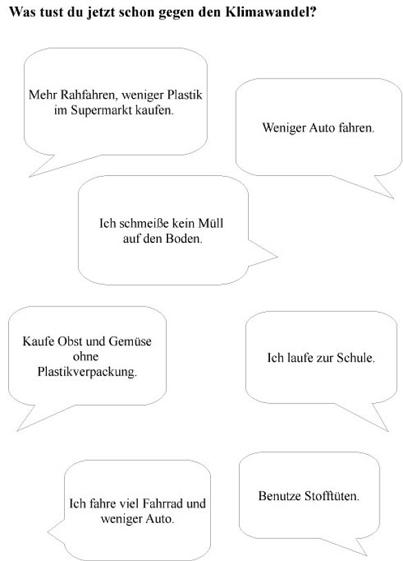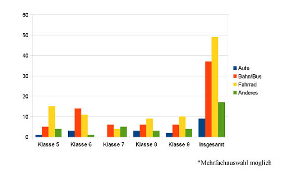 Ich finde, dass wir zu wenig „Anderes“ haben, zum Beispiel zu Fuß, mit dem Roller oder mit dem Skateboard. Der größte Teil fährt aber schon mit dem Fahrrad, was gut für unser Erde ist. Zu viele fahren aber trotzdem noch mit der Bahn oder dem Bus, was aber trotzdem besser ist, als mit dem Auto. (jd)