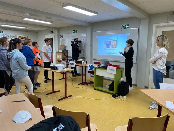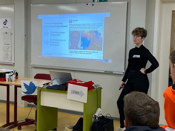 Was unterscheidet eine Moderator/in von einer Redakteur/in? - Dies und weiteres wurde uns anschließend erklärt.Welche Social Media Apps benutzt ihr so? Viele Apps wurden von den Schülern aufgelistet und direkt danach durften wir aufstehen. Beim Reingehen hatte ich schon bemerkt, dass im Klassenraum Logos von Social Media Apps wie Instagram, Twitter,.. überall verteilt aushingen.Uns wurden Fragen gestellt wie „Wo hört ihr Podcasts?“ und zu der App mussten wir uns dann hinstellen.Fake News, was sind Fake News? Wie erkennt man Fake News? Mit einer spaßigen Übung konnten wir das feststellen: An beiden Enden des Lehrerpults wurden Schilder aufgehängt, bei dem linken stand „real“ und beim rechten „fake“. An der Leinwand wurden nacheinander Fotos gezeigt und wir mussten entscheiden, ob sie real oder fake sind und das dann noch begründen.Zum Schluss durften wir unsere eigene Fake News (meiner Meinung nach das Beste von allem) schreiben und wer wollte, konnte das dann noch vorlesen. Die Stunde kam zu einem Ende und wir wurden nach Feedback gefragt. Es gab keinen einzigen negativen Kommentar! Kaum zu glauben, dass man in einer Doppelstunde so viel über Medienkompetenz lernen kann, ohne dass einem langweilig wird. Ich finde es gut, dass es spaßig gestaltet wurde und