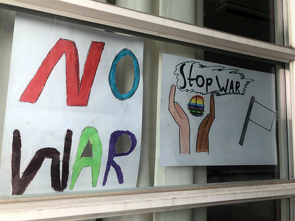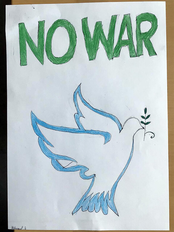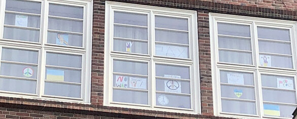 Wir können nicht viel tun, aber wir wollen zeigen, dass es Frieden geben soll. Überall auf der Welt! Darum haben wir Friedenssymbole in unsere Klassenzimmerfenster gehängt.