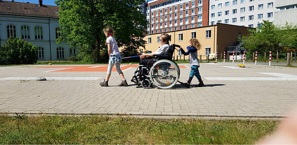 Anfangs hatte ich Krücken, damit ich mich möglichst selbstständig fortbewegen konnte. Trotzdem gab es viele Situationen, in denen mir das nicht gelang. Schließlich bekam ich dann einen Leihrollstuhl und später meinen eigenen!