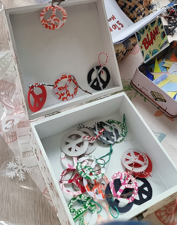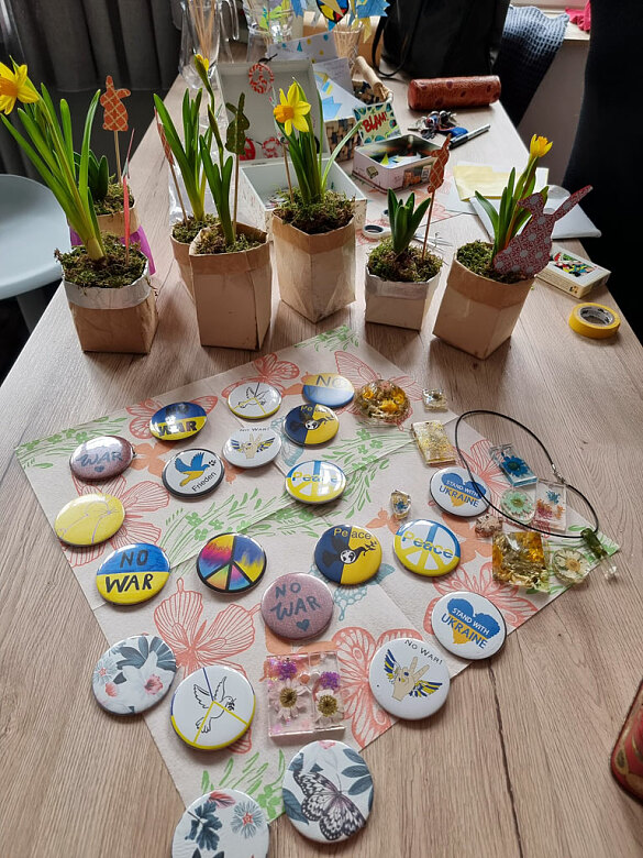 Kurz vor den Osterferien gab es einen kleinen österlichen Verkaufstand im Lehrerzimmer der Schaumburger. Frau Lübbers hatte mit ihren Schüler:innen im Unterricht für den Frieden in der Ukraine Peace-Anhänger, Postkarten mit Friedensmotiven, Fähnchen und Sticker in Form von Friedenstauben und Herzen hergestellt.