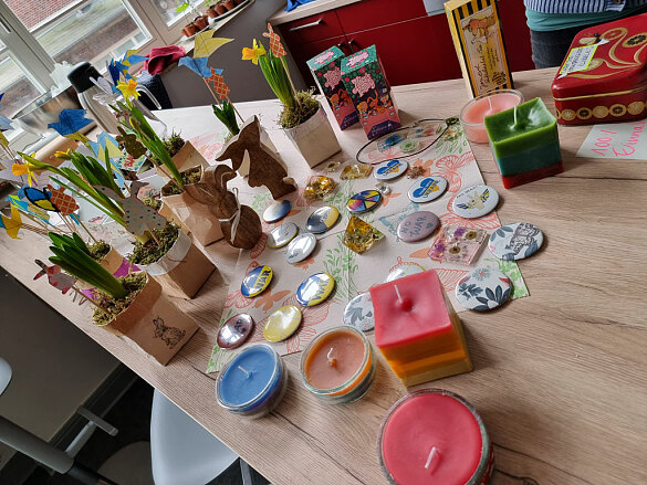 Ebenso kreativ waren Frau Aden und Frau Turan zusammen mit den Teilnehmer:innen der Schülerfirma und ihrer Klasse 7c. Neben Frühblühern in nachhaltigen Blumentöpfen aus Tetra Pak und Kerzen aus alten Kerzenresten hatten sie Buttons und Magnete mit selbstgemalten Peace-Symbolen produziert.