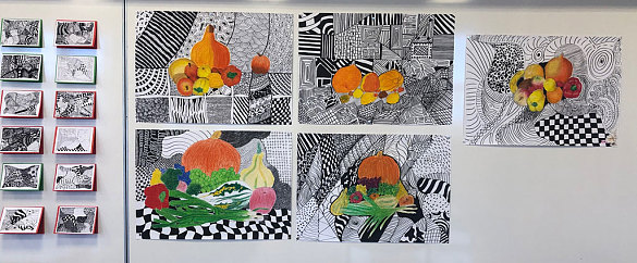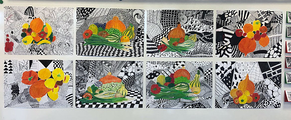 Ein Wunsch der Schüler war es, ein Stillleben anzufertigen. Und so wurde das mitgebrachte Obst und Gemüse arrangiert und mit Ölpastellfarben in farbenfrohen, detailreichen und zum Teil äußerst echt wirkenden Kunstwerken auf DIN A2 gemalt.