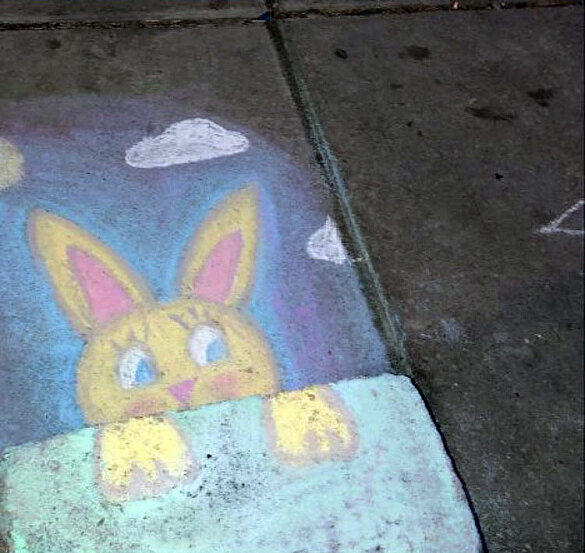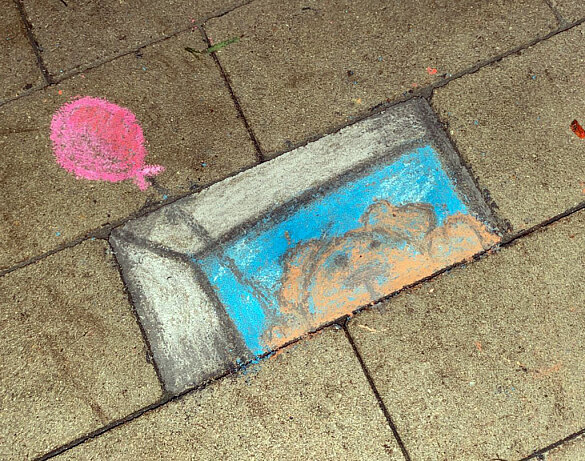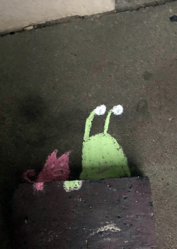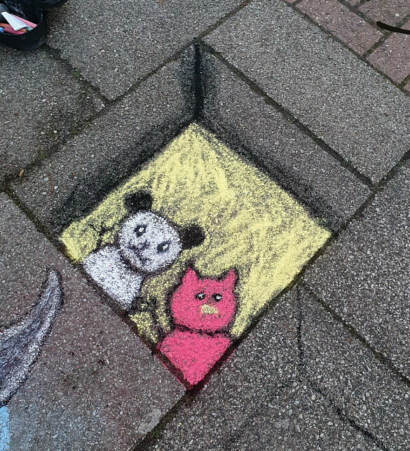 Der WP-Kunst-Kurs arbeitete zunächst ebenfalls mit Kreide – allerdings orientierten sie sich an dem Künstler David Zinn, der kleine Wesen auferstehen lässt, die dem Betrachter ein Lächeln ins Gesicht zaubern. Ein kurzes Leben, da die Bilder mit dem nächsten Regen weggespült werden.