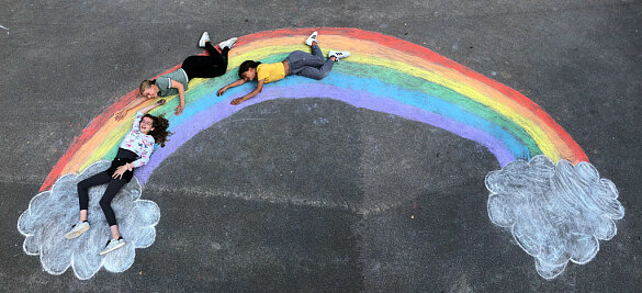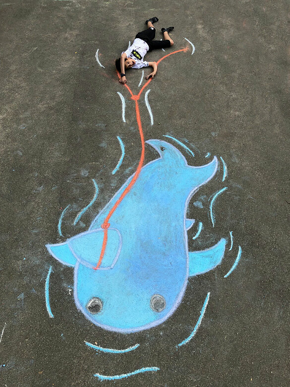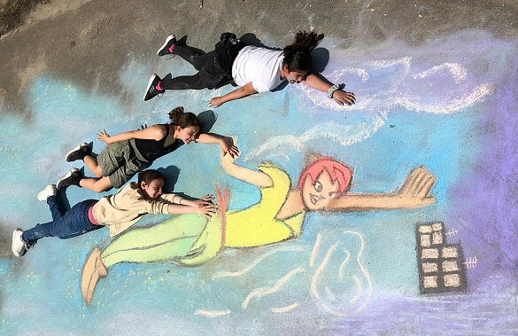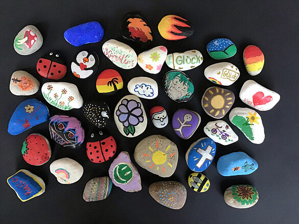 Den zeitlichen Anfang machte die Kunstprofilklasse 6d, die zu diesem Thema in ihre Projektwoche am Schuljahresanfang arbeitete. Mit Acrylfarbe wurde Fliesen angemalt, die demnächst unseren Schulhof verschönern. Flusssteine sind mit Wünschen und Grüßen bemalt worden, um sie im Schulbezirk zu verteilen und mit Kreide hat die Klasse gleich zwei Mal auf dem Außengelände der Schule gearbeitet. Beim zweiten Mal war es die Aufgabe, sich selbst mit auf das Kreidebild zu platzieren und durch eine Fotoaufnahme „von oben“ einen Perspektivwechsel zu bewerkstelligen.