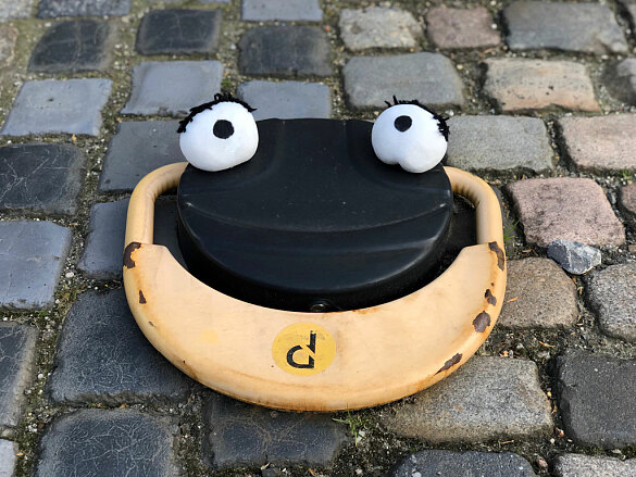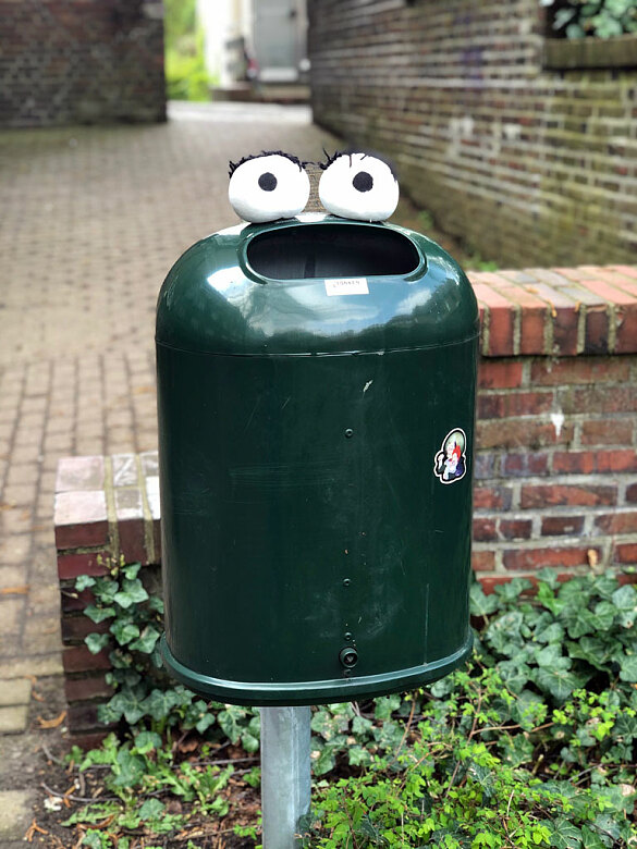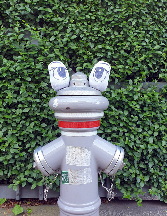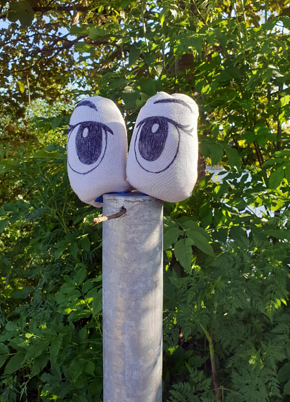 Von noch kürzerer Lebensspanne sind die „Augen“-Werke: Hier sollte aus alten Socken, Tischtennisbällen oder Stoffresten zwei Augen angefertigt werden, die auf den nächsten Spaziergängen auf Mülltonnen, Hydranten, Baumstümpfen usw. drapiert und dem Betrachter so den Eindruck einer Gestalt zu suggerieren.