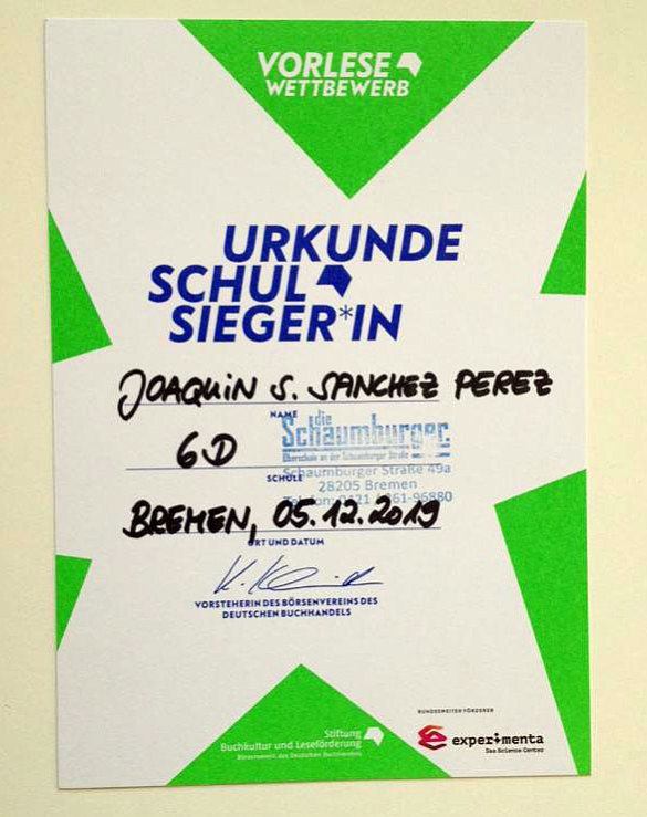 Einen herzlichen Dank an das Organisationsteam. Und noch einmal einen herzlichen Glückwunsch an Quini, der auf Landesebene unsere Schule hoffentlich gut vertreten wird. Wir drücken die Daumen für den Wettbewerb im Frühjahr.