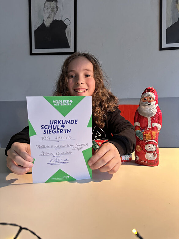 Und noch einmal einen herzlichen Glückwunsch an Emil, der auf Landesebene unsere Schule hoffentlich gut vertreten wird. Wir drücken die Daumen für die nächste Runde des Wettbewerbs im Frühjahr.