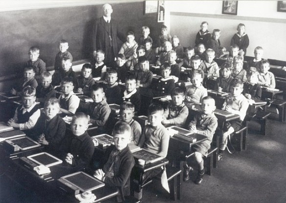 Grundschulklasse mit 45 Schülern, Schiefertafeln und Matrosenanzügen (ca. 1932)
